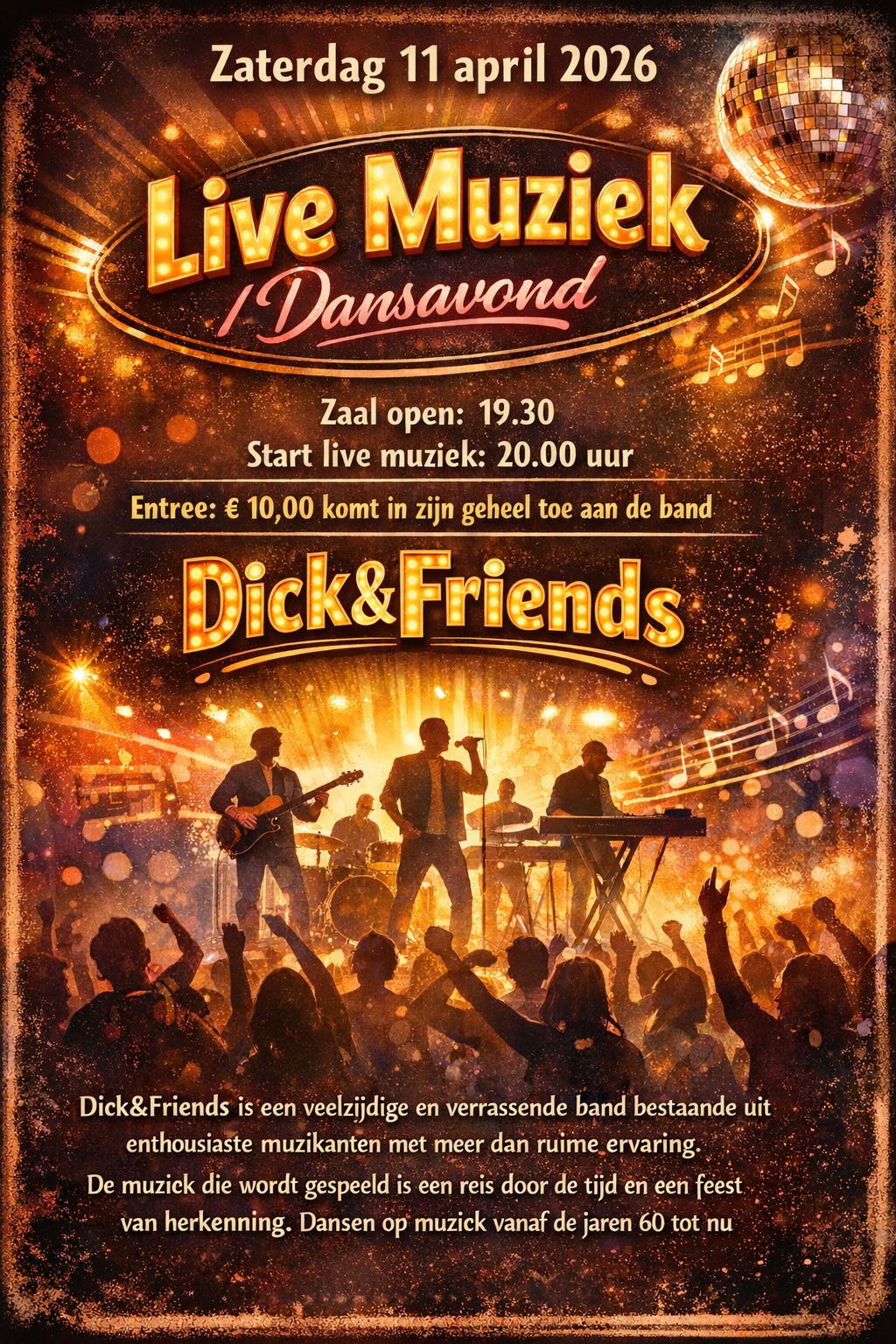 Weer eens wat anders? Dick&Friends is een veelzijdige en verrassende band bestaande uit enthousiaste muzikanten met meer dan ruime ervaring. De muziek die wordt gespeeld is een reis door de tijd en een feest van herkenning. Dansen op muziek vanaf de jaren 60 tot nu. Een greep uit het repertoire o.a. The Trammps, George Michael, Eric Clapton, Stevie Wonder, KC and the Sunshine band, Michael Jackson, Bob Marley, Elvis Presley en vele andere prominenten. De band maakt muziek die ze zelf leuk vindt en bij het publiek in de smaak valt. Plezier in het musiceren staat voorop en de rest volgt vanzelf.